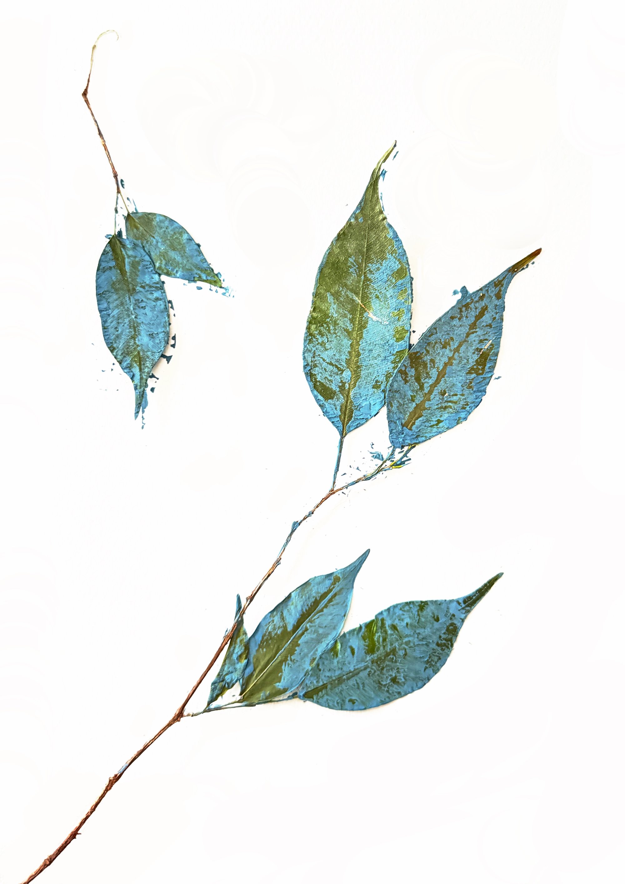 This print was created from a small dried and painted branch of Ficus Benjamin. Its natural colors, combined with a light blue varnish, imprinted on fine recycled floral paper, embody the essence of nature and transform it into art.