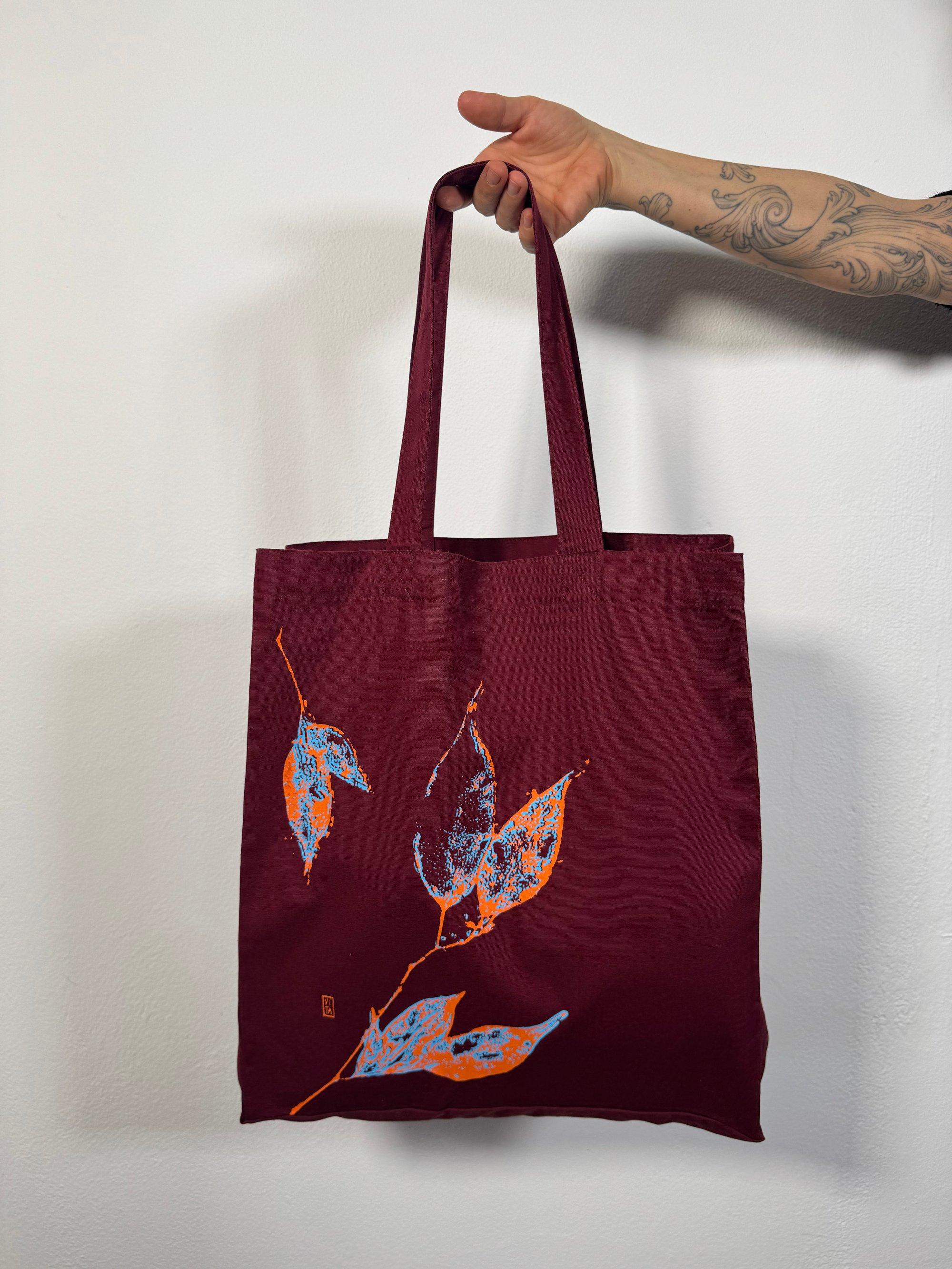 Recatangular shopping bag with gusset in heavy cotton canvas. Burgundy colour with screenprinted ''Ficus Benjamin'' leaves in fluo orange and blue. Inside pocket. Measurements: 40x37x10 cm